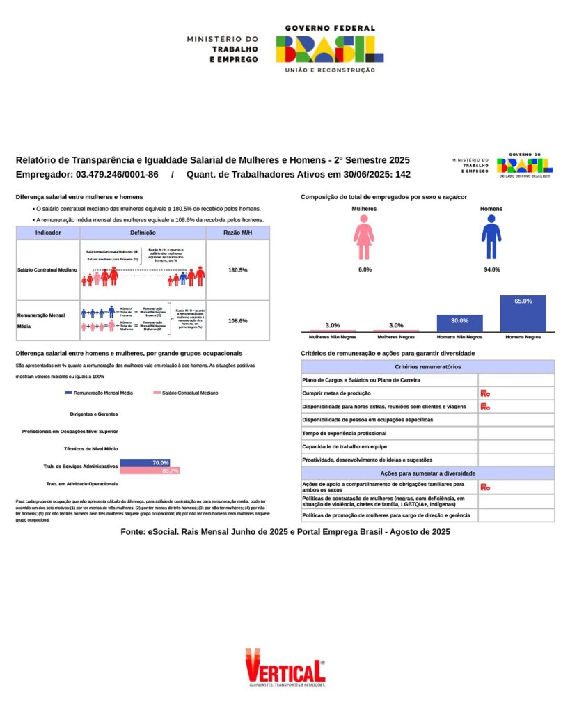 A Vertical Equipamentos LTDA, CNPJ: 03.479.246/0001-86 torna público o Relatório de Transparência e Igualdade Salarial de Mulheres e Homens, elaborado pelo Ministério do Trabalho e Emprego (MTE), a partir dos dados coletados do Esocial, Rais e Portal Emprega Brasil. A Vertical Equipamentos LTDA faz esta publicação nos próprios canais de comunicação (Site e Redes sociais) em virtude das determinações feitas pela pasta ministerial do MTE.